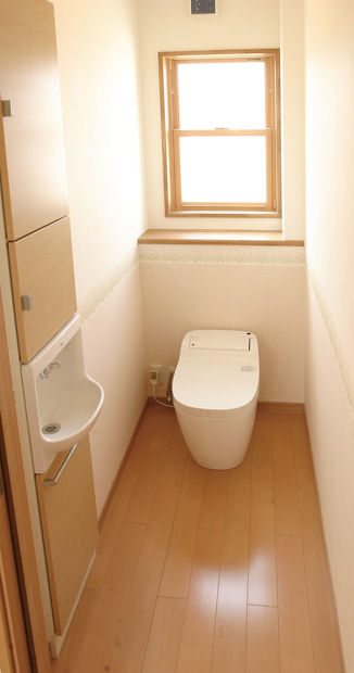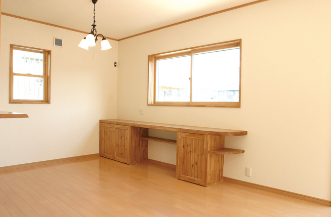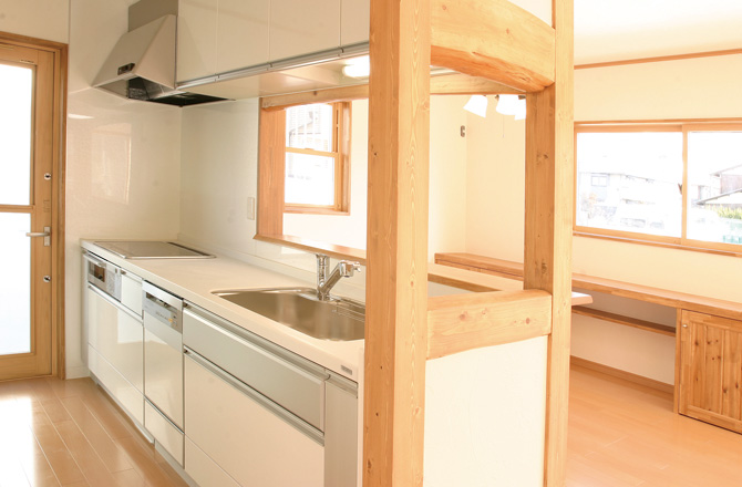 外観はピンクの屋根に、壁はジョリパットのコテ塗り仕上げで、玄関の上は1枚ずつタイルを貼ってあります。 家族との会話を楽しみながらお料理できるカウンターキッチンと、広々としたリビング。最大限に光が差し込む設計となっており、木のぬくもりと解放感があります。